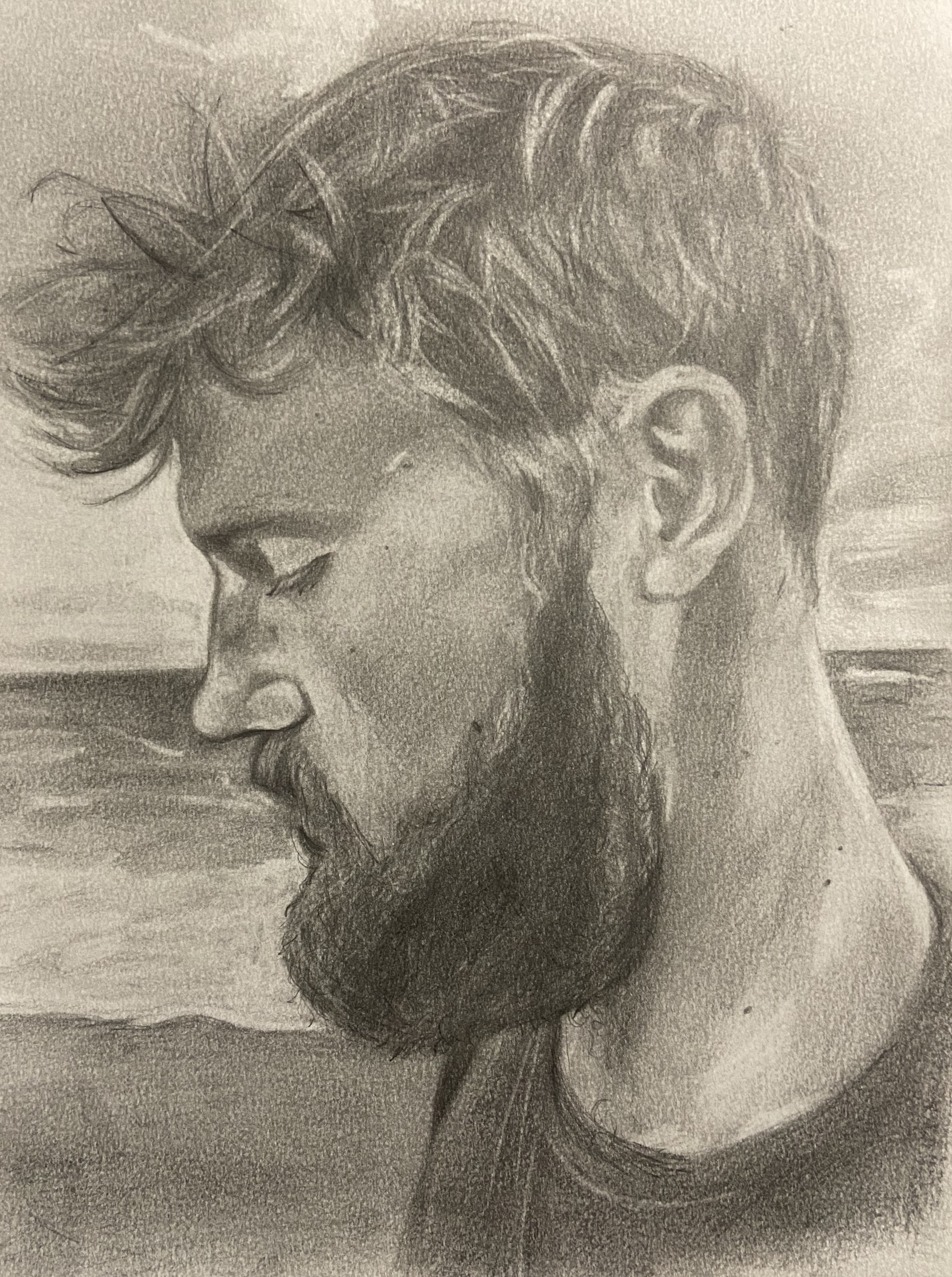 (9”x 12”) graphite on mixed media paper. This portrait was a study on profiles. The focus of this study was to capture emotion and atmosphere with a side profile shot.